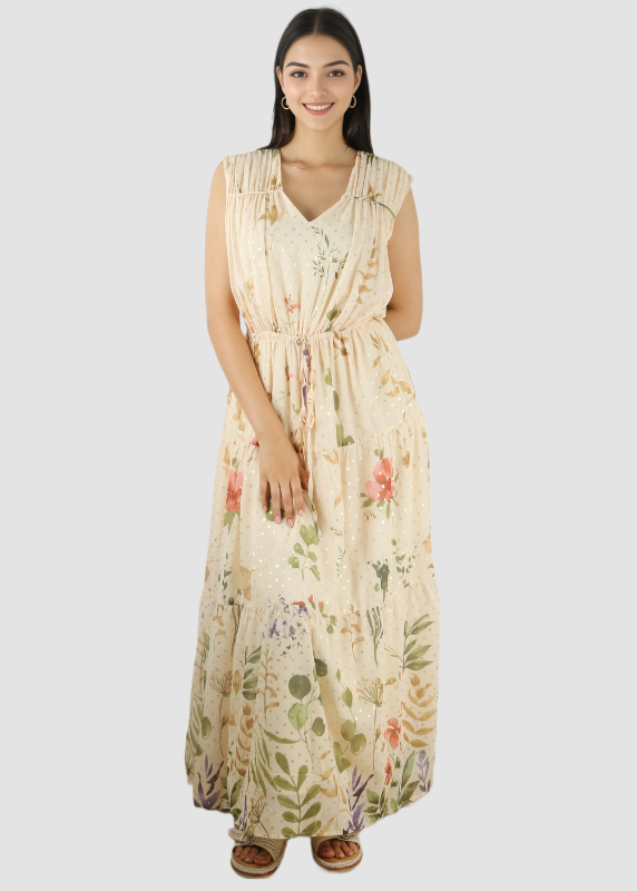 - Robe longe fluide, coupe évasée avec finition plissée pour un tombé élégant et une belle liberté de mouvement.