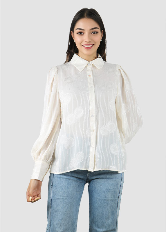 - Chemise élégante à col montant froncé et manches longues légèrement bouffantes.