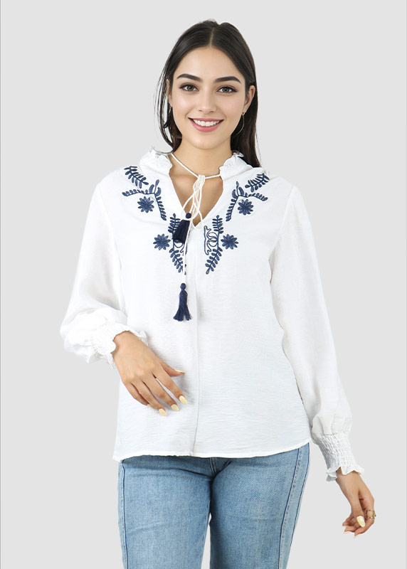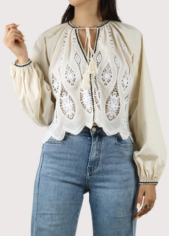 - Tissu léger, fluide et légèrement transparent, orné de broderies raffinées sur le devant et les poignets.