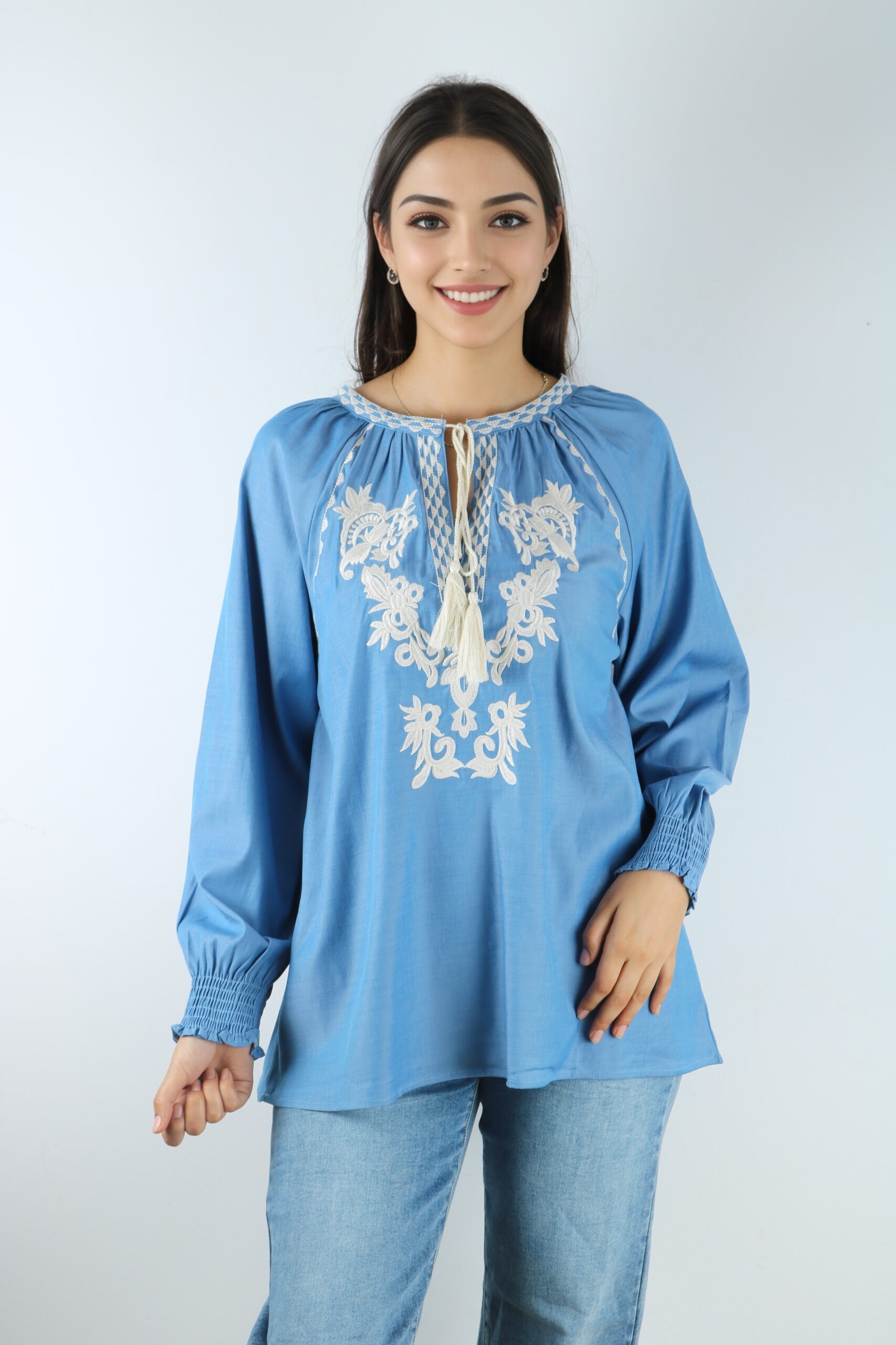 - Tissu léger, fluide , orné de broderies raffinées sur le devant et les poignets.