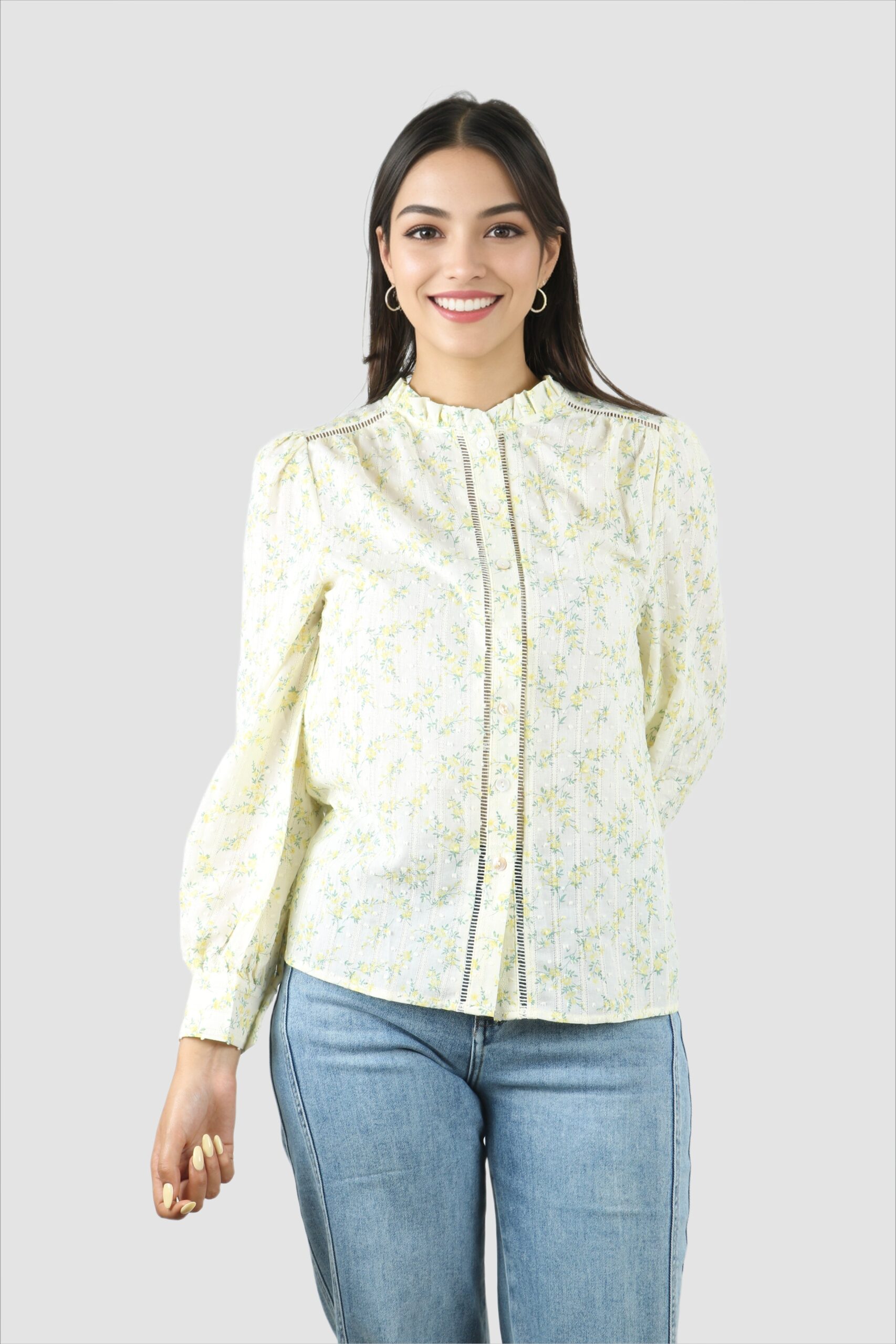- Chemise élégante à col montant froncé et manches longues légèrement bouffantes.