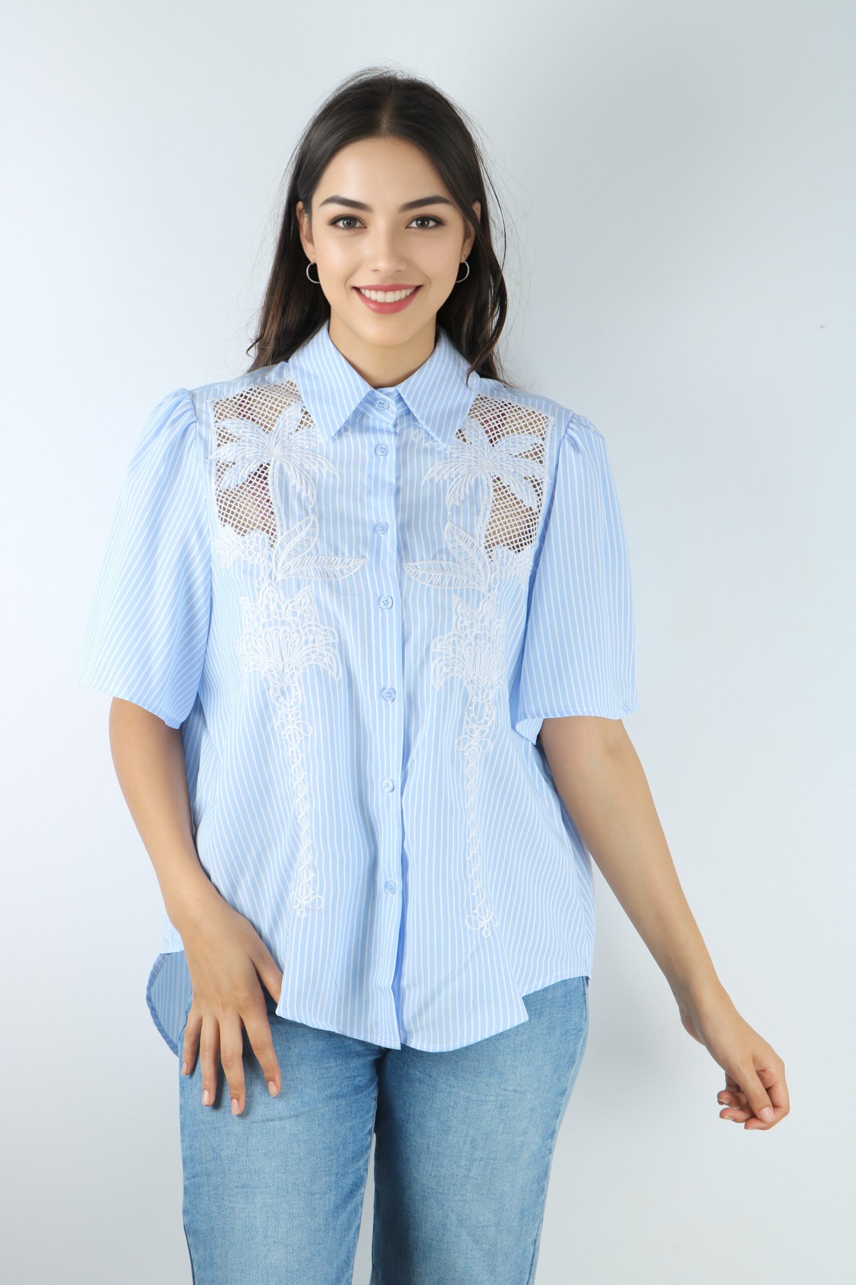- Tissu léger, fluide et légèrement transparent, orné de broderies raffinées sur le devant et les poignets.