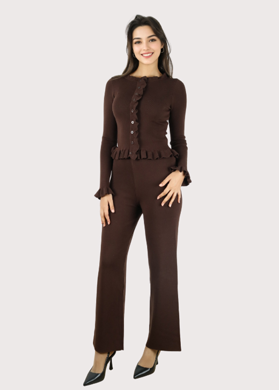 Style : Ensemble deux pièces composé d’un haut boutonné et d’un pantalon fluide assorti.