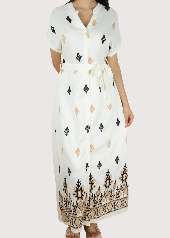 - Col chemise avec une rangée de boutons décoratifs, ajoutant du charme à l’ensemble.