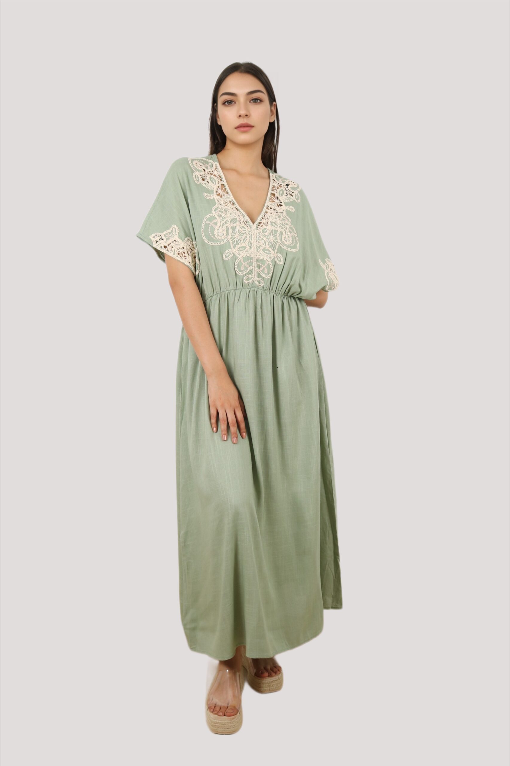 - Tissu léger, fluide et légèrement transparent, orné de broderies raffinées sur le devant et les poignets.
