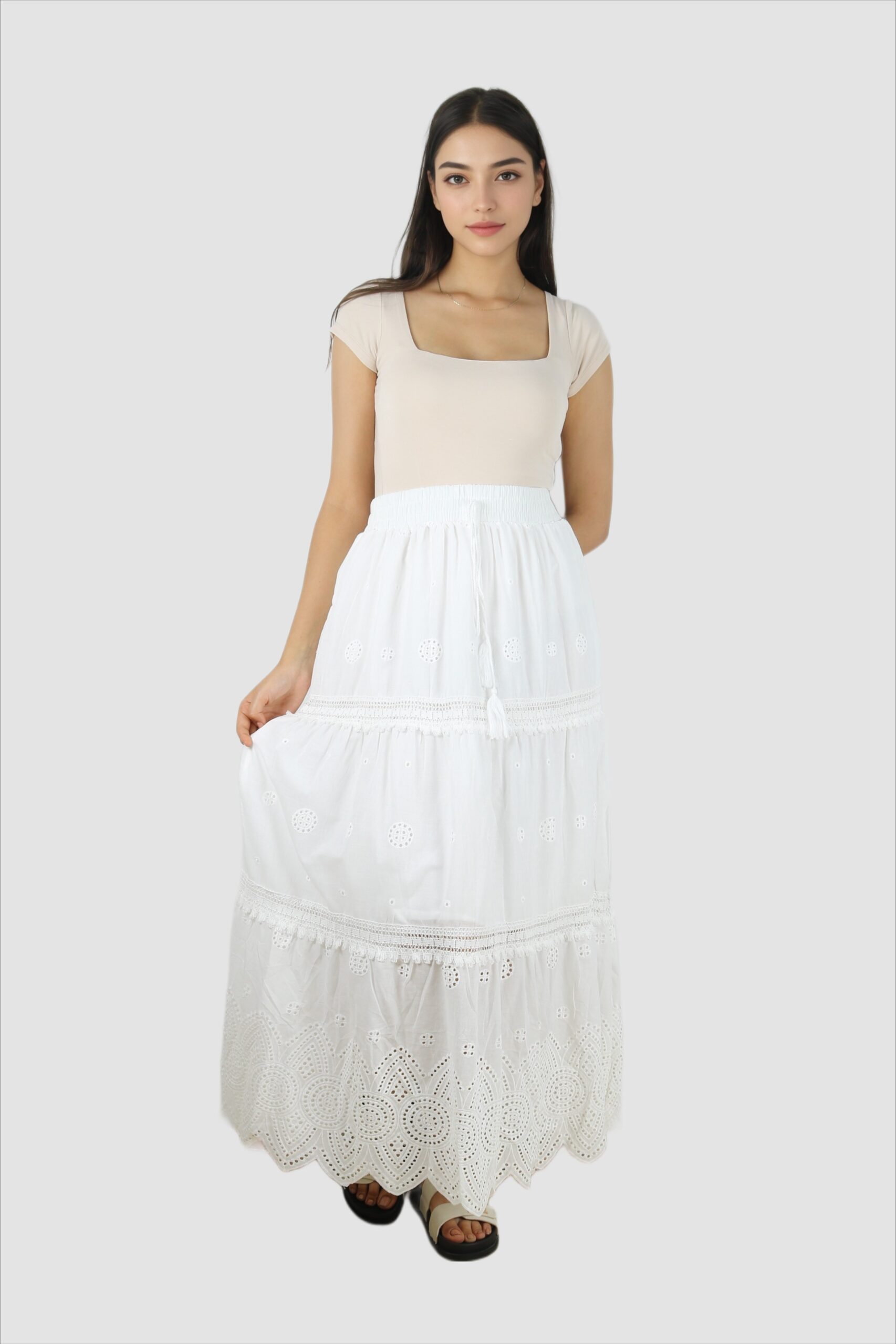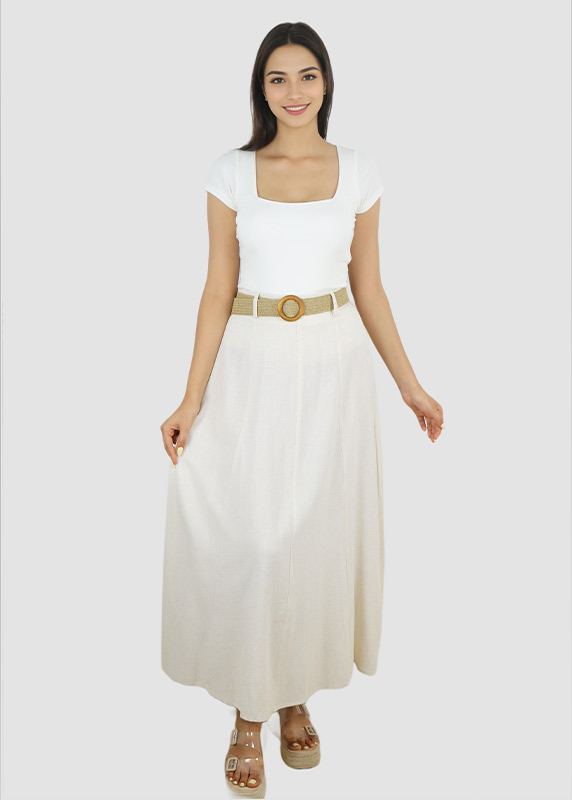 • Jupe longue fluide à taille haute.