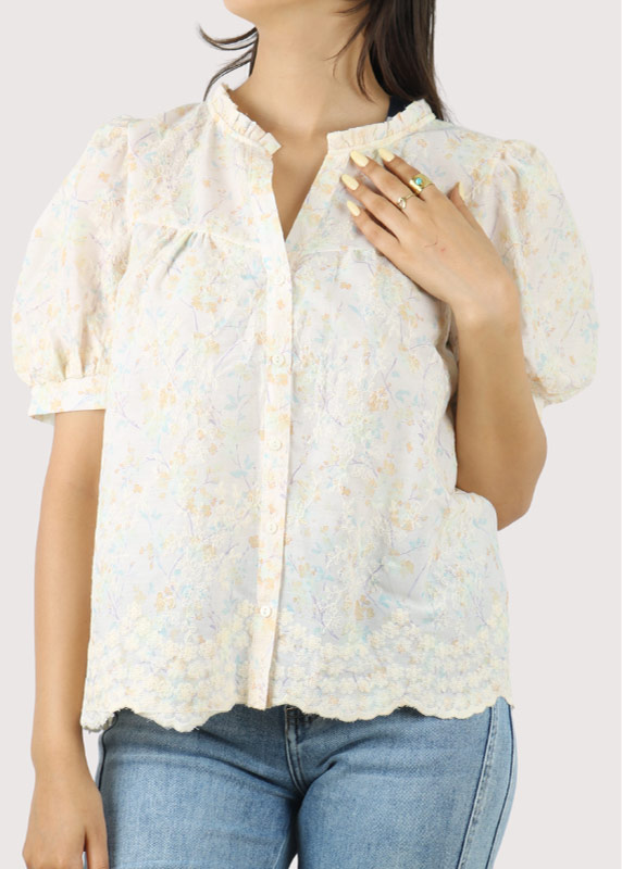 - Tissu léger, fluide et légèrement transparent, orné de broderies raffinées sur le devant et les poignets.