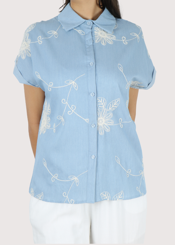 - Tissu léger, fluide et légèrement transparent, orné de broderies raffinées sur le devant et les poignets.
