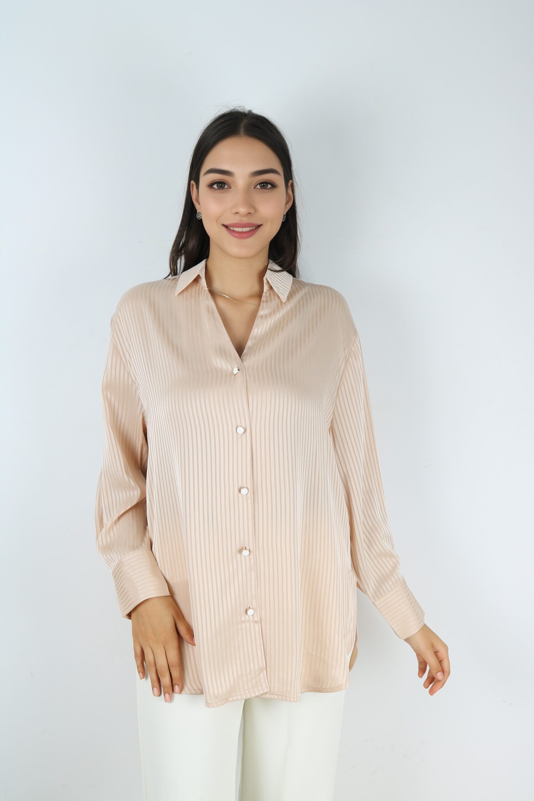 - Tissu fluide et doux avec rayures verticales discrètes.