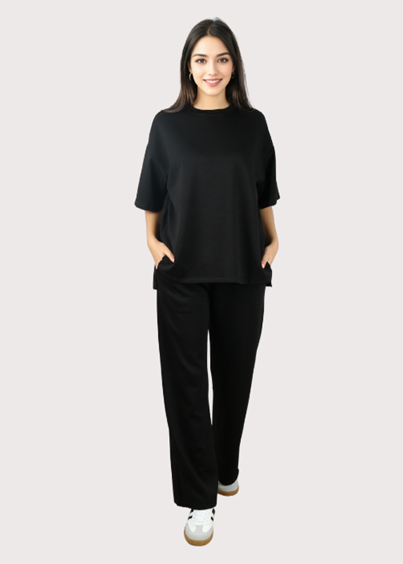- Ensemble : Duo parfait composé d’un haut ample (« oversize ») à manches mi-longues et d’un pantalon large et fluide assorti.