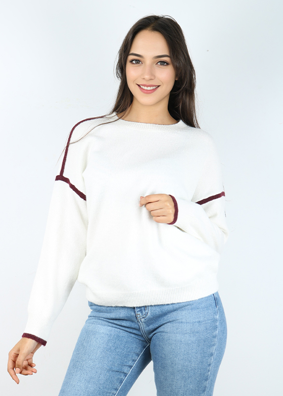 Détails : Fines lignes de couleur bordeaux le long des coutures des épaules et des manches, ainsi que des bordures bordeaux aux poignets et à l’ourlet.