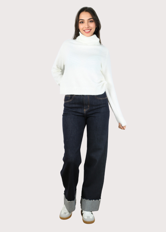 Détails : Taille haute classique avec passants de ceinture. Le bas de la jambe présente un large revers visible avec une finition effilochée brute. Poches avant et arrière classiques.