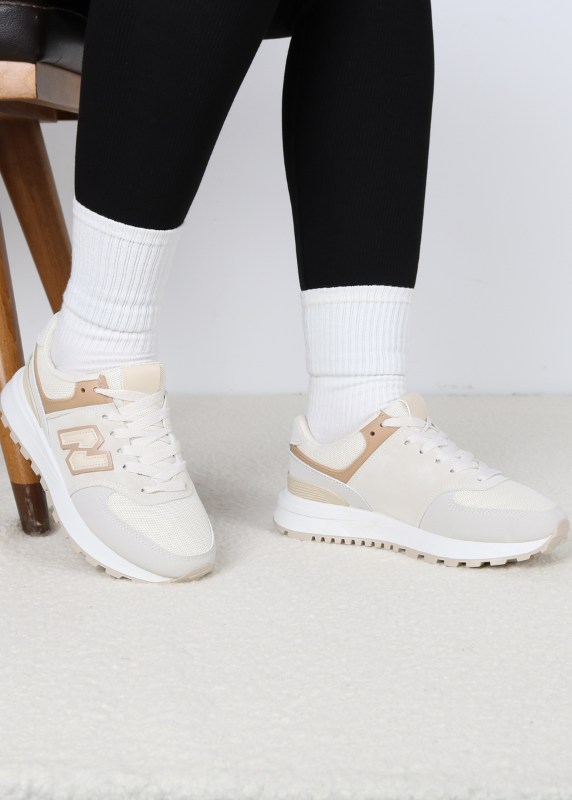 Ces baskets offrent un look élégant et polyvalent avec des tons neutres et un profil épais et moderne. -