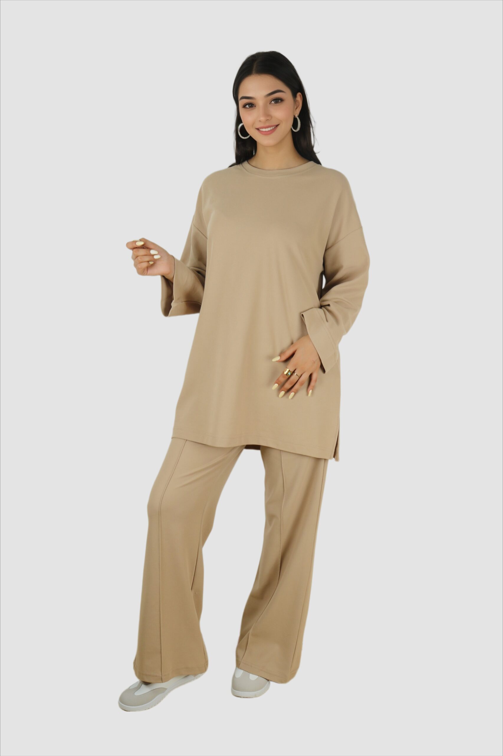 - Ensemble élégant composé d’un pull mi-long et d’un pantalon en maille douce.