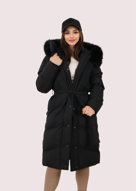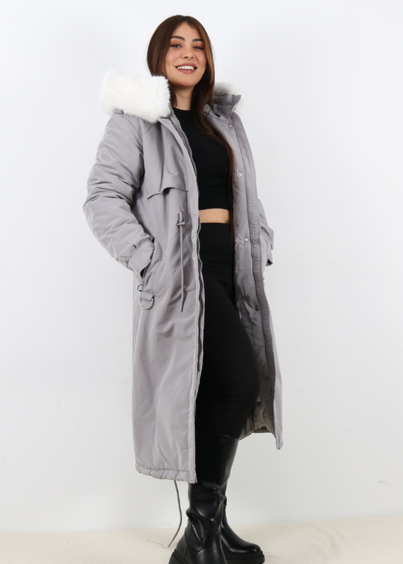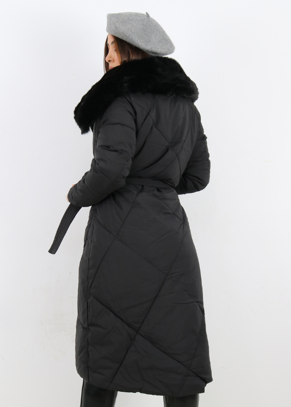 - Manteau long et élégant avec col en fourrure douce.