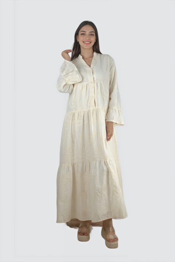 - Col chemise avec une rangée de boutons décoratifs, ajoutant du charme à l’ensemble.