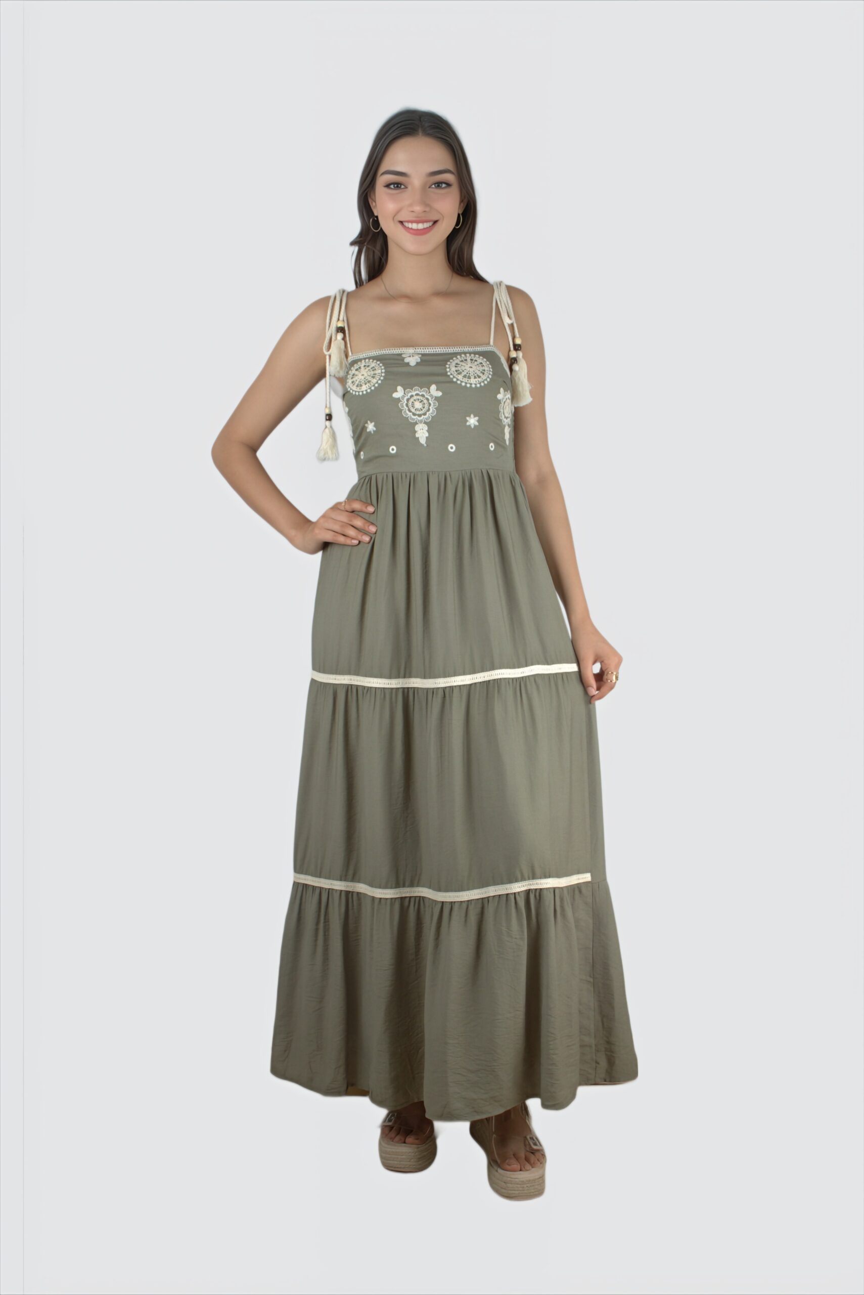 - Robe longe fluide, coupe évasée avec finition plissée pour un tombé élégant et une belle liberté de mouvement.