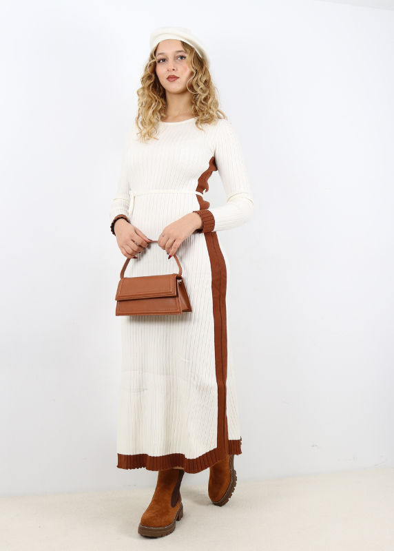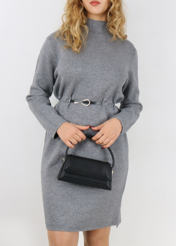 - Robe longue et droite : Confectionnée en maille gris clair avec une texture douce et un effet côtelé discret.