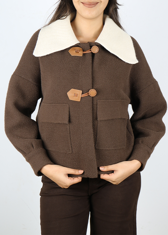 Col : Col classique en tissu contrasté de couleur marron foncé.