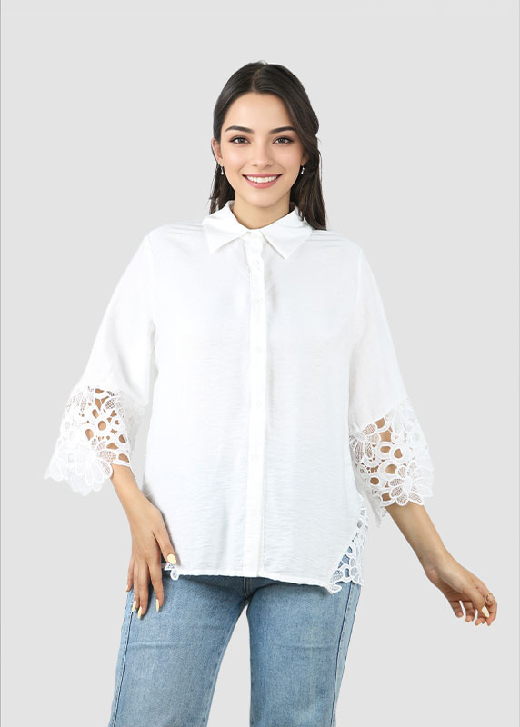 - Tissu léger, fluide et légèrement transparent, orné de broderies raffinées sur le devant et les poignets.