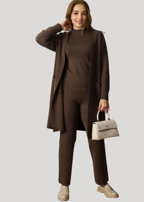 - Ensemble élégant composé d’un pull mi-long et d’un pantalon en maille douce.