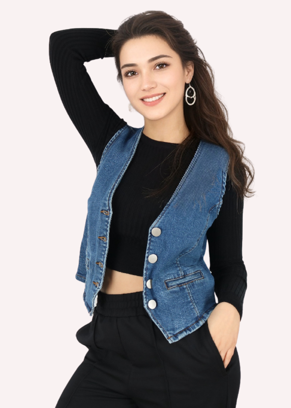 • Gilet en denim bleu sans manches.