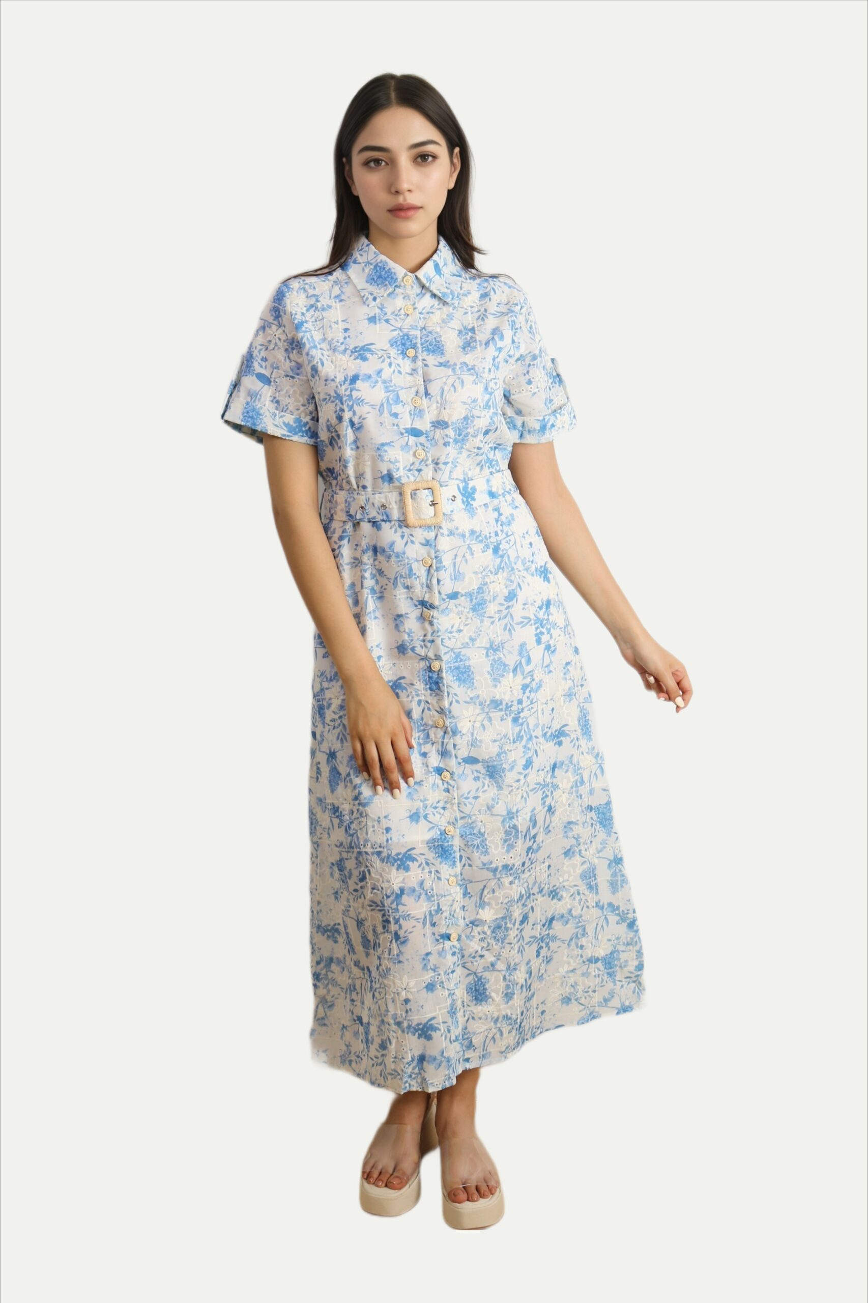 - Robe longue patineuse à motifs floral avec volant sur les manches.