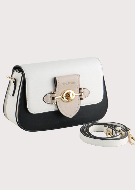 - Fermeture à rabat avec un fermoir rotatif métallique doré original.