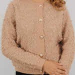 • Vêtement : Cardigan texturé camel avec un effet bouclé.