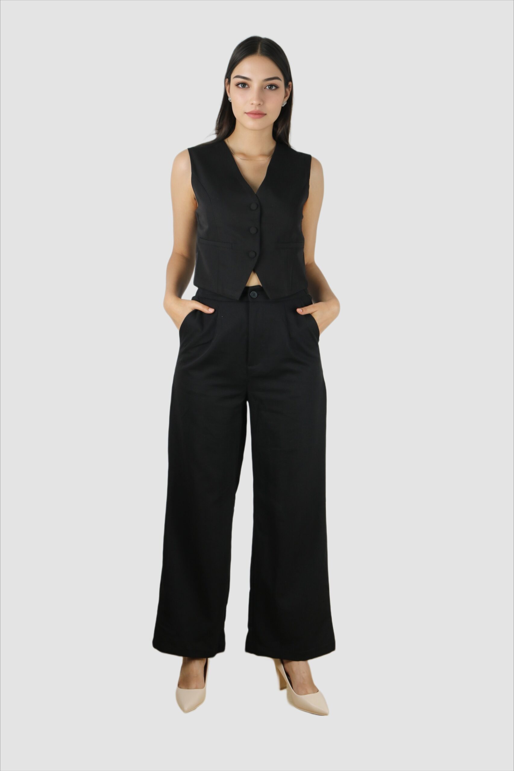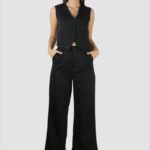• Composé d’un gilet sans manches à col en V et d’un pantalon fluide à taille haute.