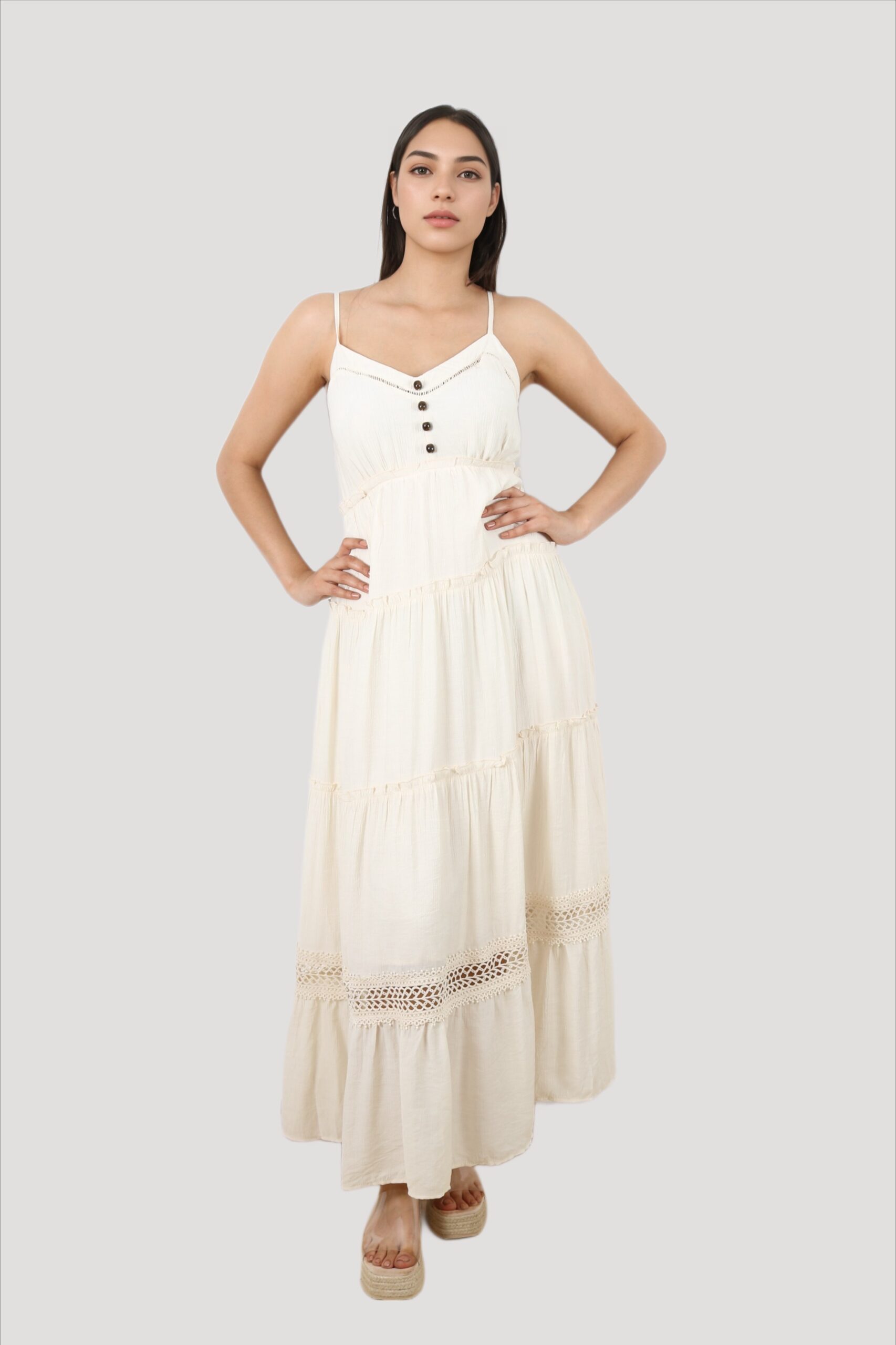 • Robe longue fluide, coupe évasée avec finition plissée pour un tombé élégant et une belle liberté de mouvement.