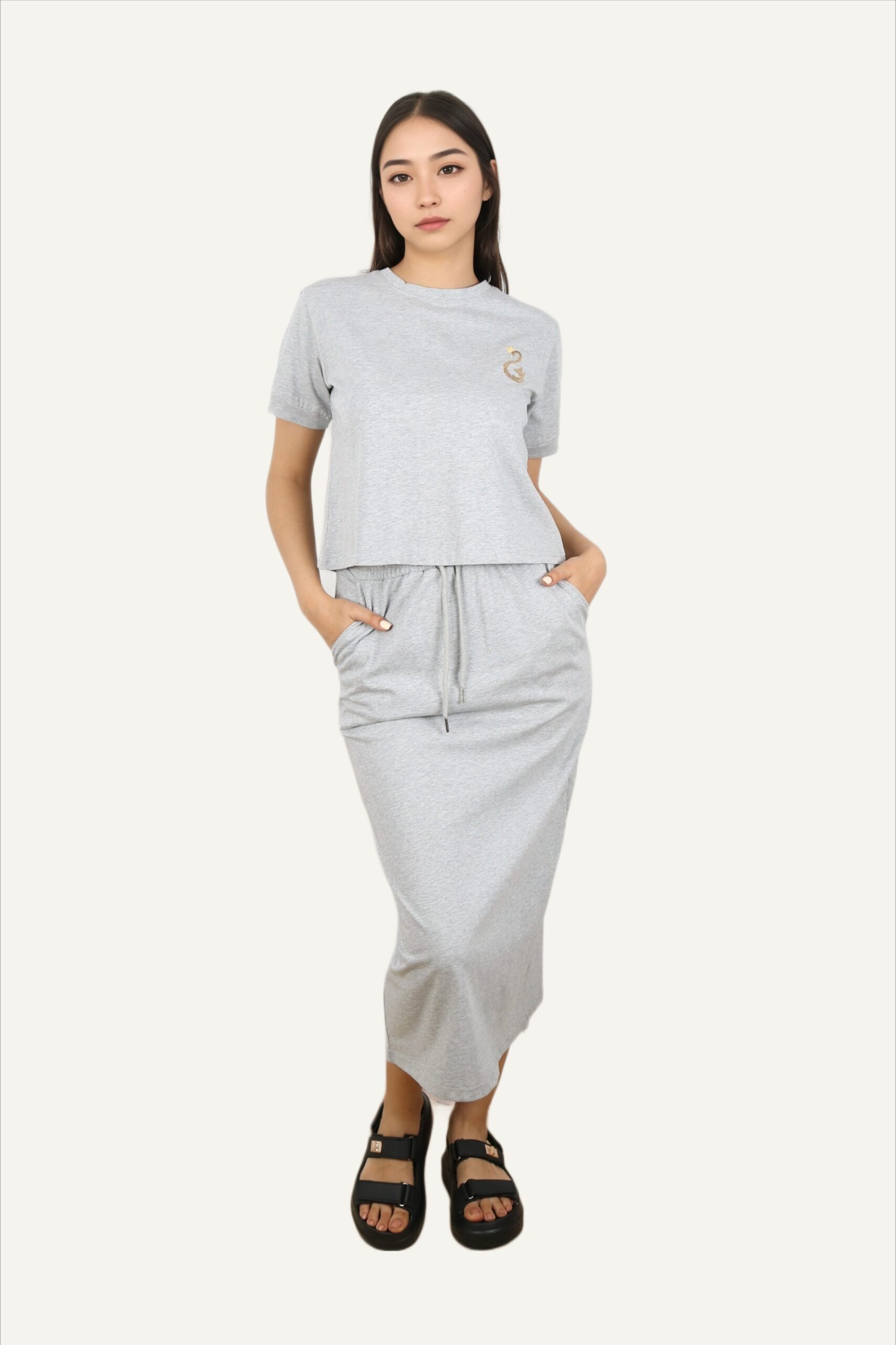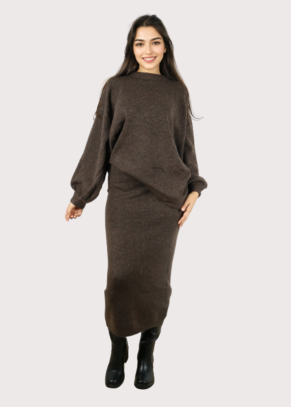 Coupe : Ensemble coordonné (twin-set). Le haut est un pull oversize à col rond. Le bas est une jupe longue de coupe droite et fluide.
