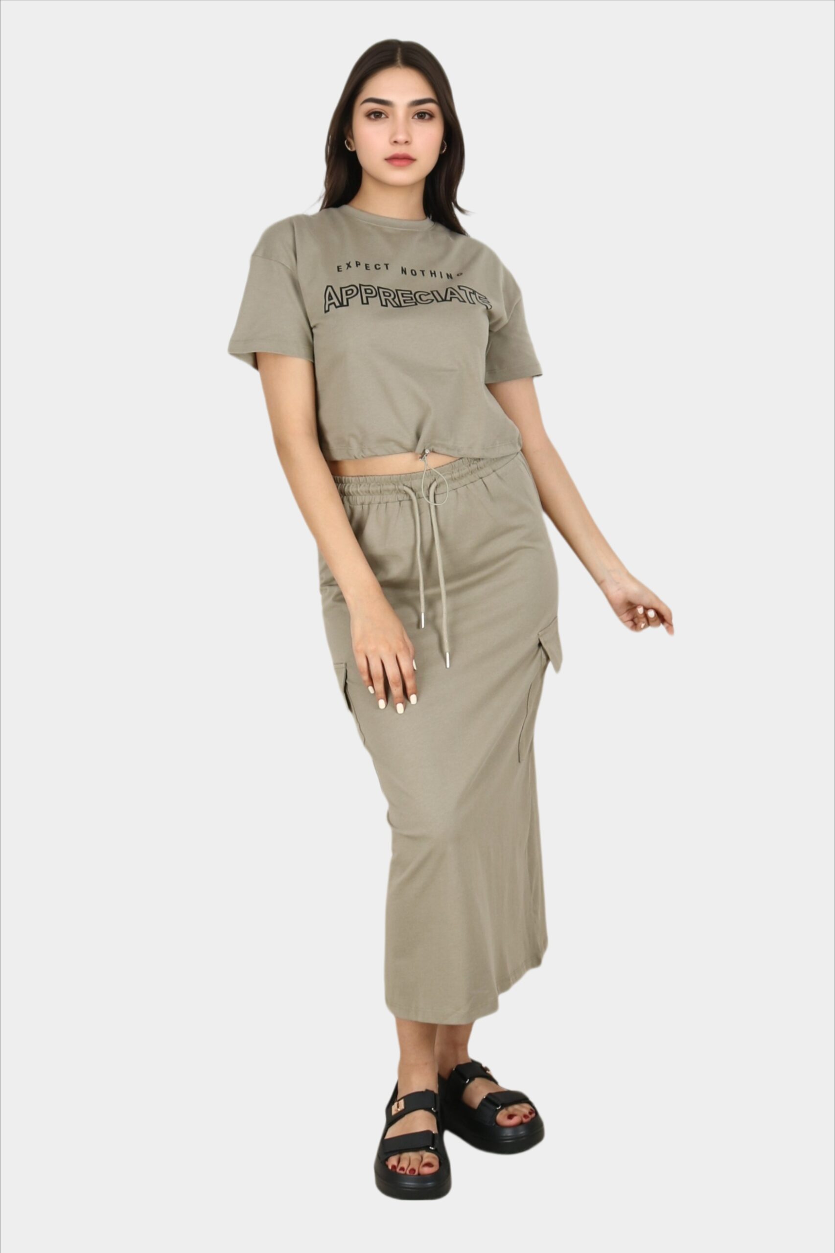 109.900 TNDVue Rapide- T-shirt à manches courtes avec message imprimé « EXPECT NOTHING, APPRECIATE », coupe droite légèrement courte avec un lien de serrage à la taille pour une touche tendance.