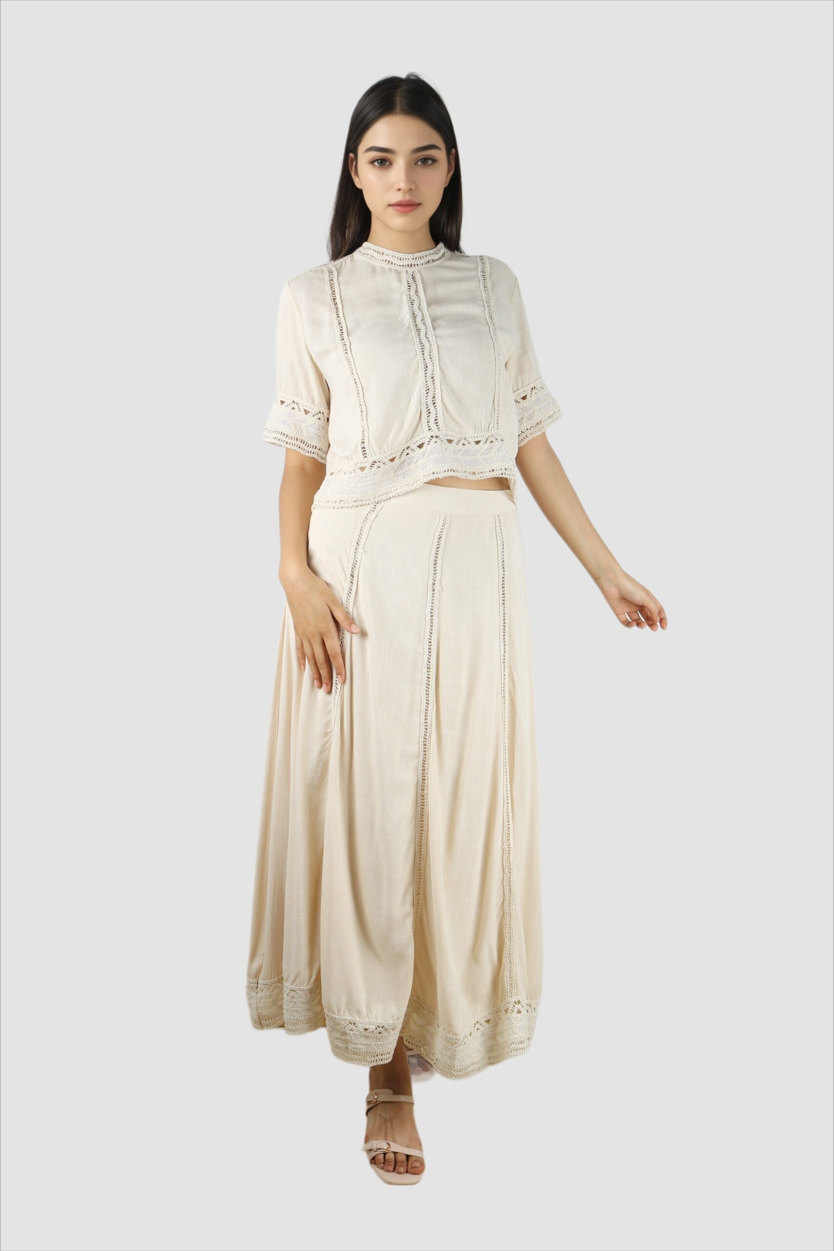 - Composé d’un haut à manches courtes en dentelle et d’une jupe longue fluide.