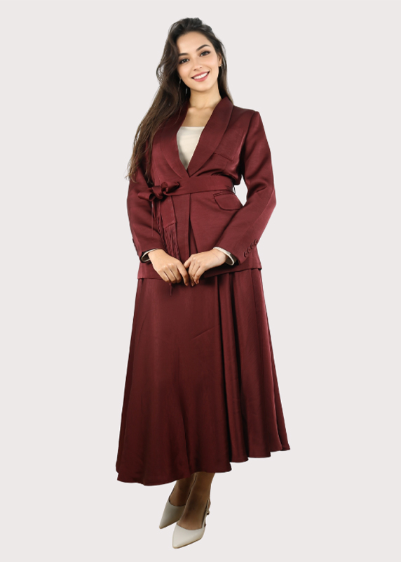 • Coupe : Ensemble coordonné (tailleur) composé d’une veste et d’une jupe. La veste est courte et cintrée. La jupe est longue (maxi) et présente des plis soleil fins.
