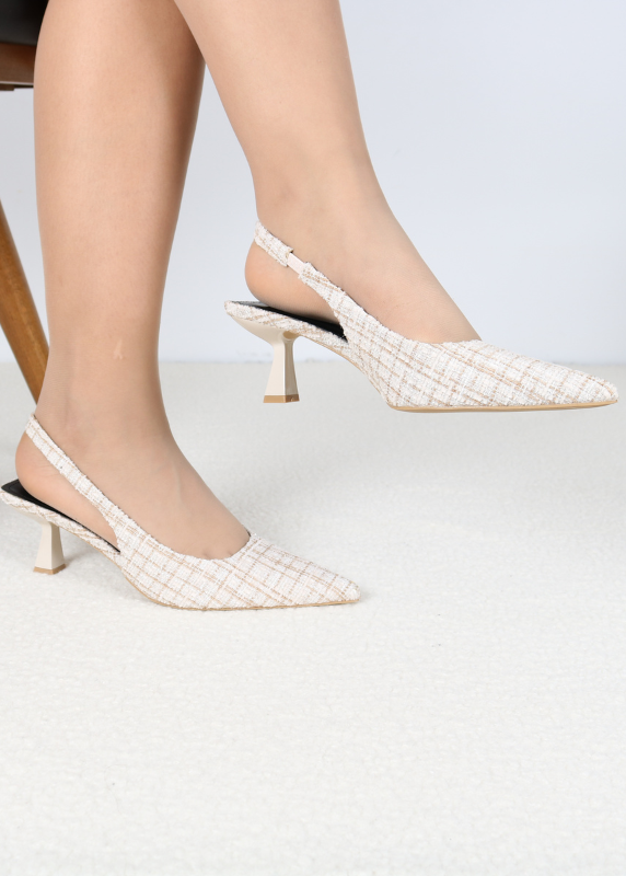 - Escarpins beiges au tissu texturé pour un style élégant et raffiné.