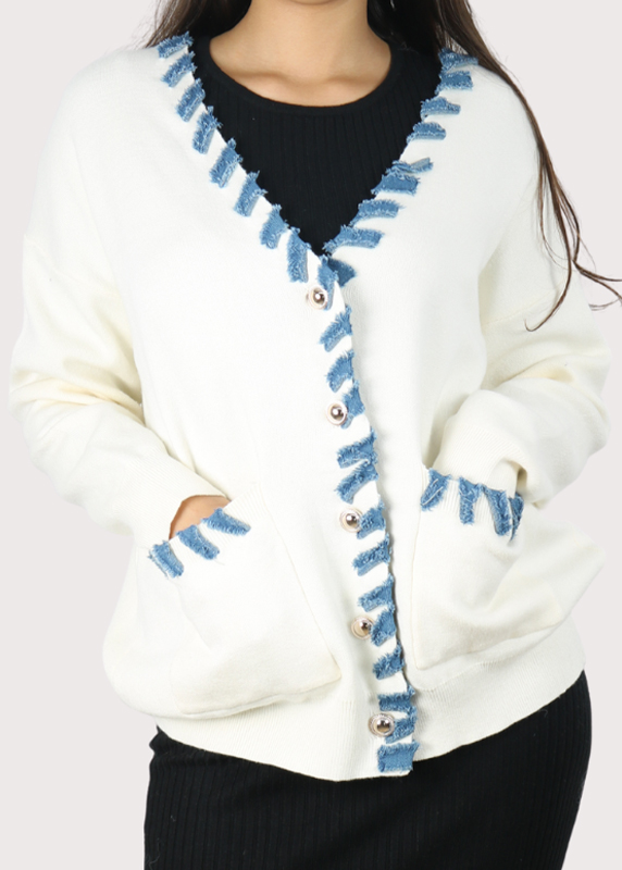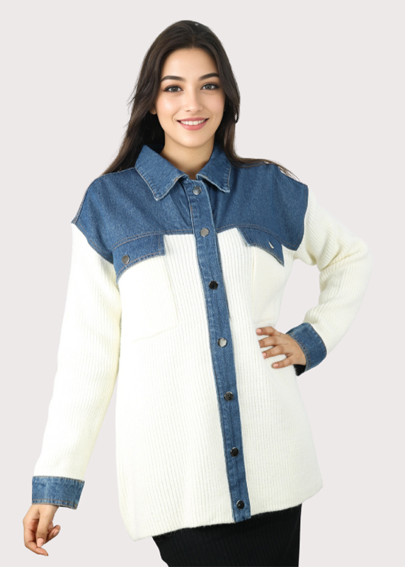 - Matières : Le haut et les poignets sont en jean bleu, tandis que le corps et les manches sont en maille blanche toute douce.
