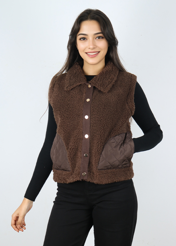 Design : Tissu doux effet mouton, fermeture par boutons et poches devant avec détails matelassés.