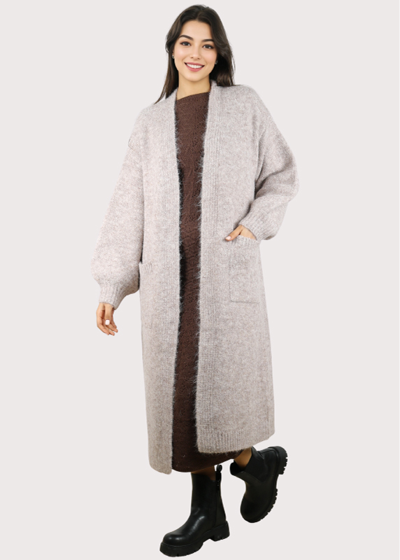 Coupe : Une coupe très longue et oversize avec des finitions en bords-côtes aux poignets et au bas du gilet.