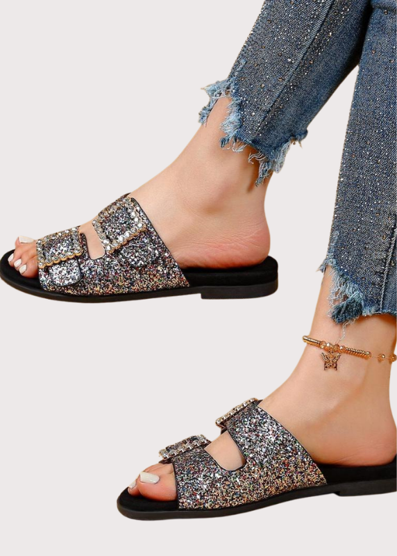 - Mules à strass avec double brides ajustables à boucles dorées.