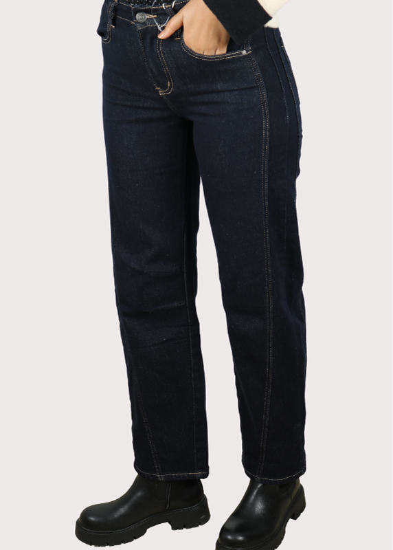 - Toile denim foncée avec surpiqûres contrastées élégantes.