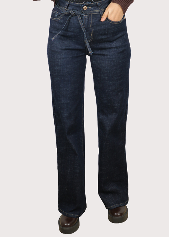 - Taille haute avec une fine ceinture en denim à nouer sur le devant.